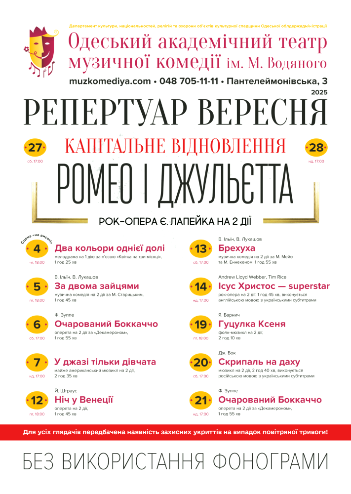 - рок-опери «Ісус Христос — суперзірка» та «Ромео і Джульєтта» — 14, 27 і 28 вересня.