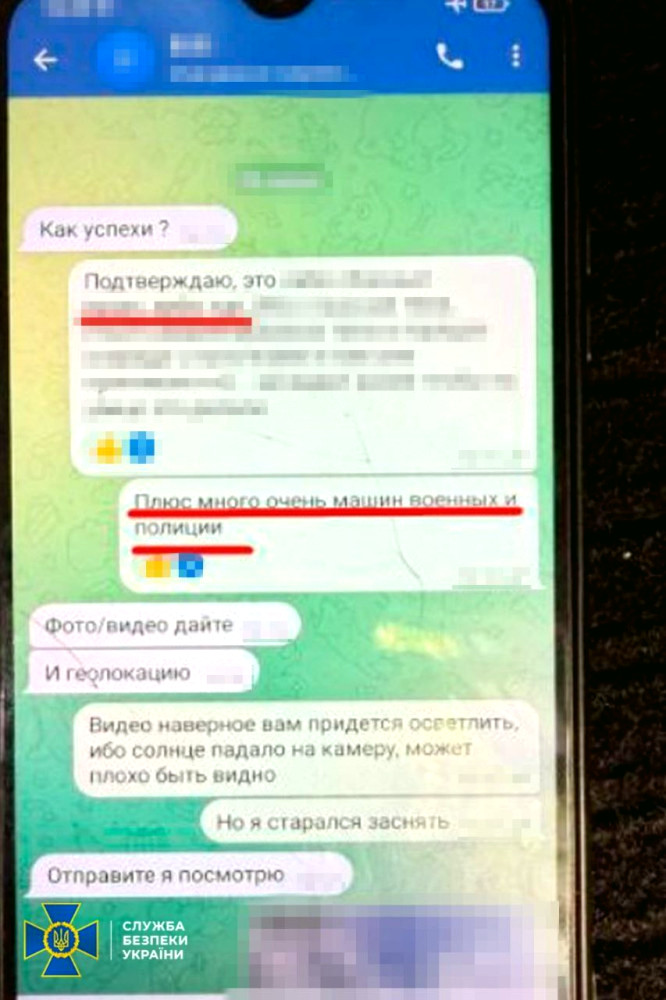 Співробітники Служби безпеки України затримали двох осіб, які працювали на російську військову розвідку (ГРУ) і займалися коригуванням авіаударів по Україні. Ці агенти планували нові ракетні та дронові атаки на Київ і Одесу. Встановлено, що вони мали завдання виявити і передати окупантам координати позицій Сил оборони. Крім того, зловмисники досліджували наслідки попередніх ворожих атак на цивільну інфраструктуру для коригування подальших ударів. Незважаючи на те, що обидва діяли окремо, у них був спільний куратор, особа якого вже ідентифікована фахівцями СБУ. Для збору інформації вони виходили на місцевість, фотографували цілі та записували їх координати.