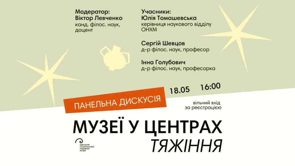 17 травня о 17:00 відбудеться презентація «Museum for Change. Підтримка музейної спільноти в умовах війни». Спікеркою буде Дарія Д’якова, голова правління ГО «Museum for Change». Вона поділиться інформацією про зміни в Одеському художньому музеї, евакуацію колекцій, міжнародну підтримку та нові виклики, з якими стикнулися музеї під час війни.