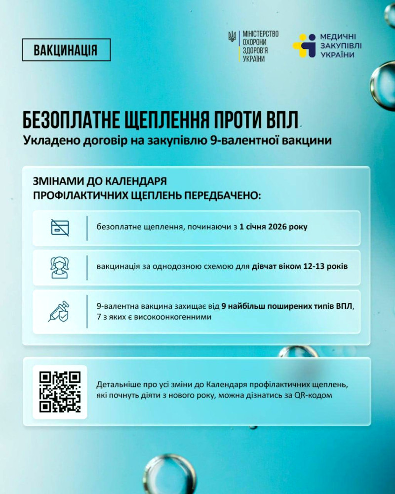 У 2026 році в Україні вперше запровадять безкоштовну вакцинацію проти вірусу папіломи людини (ВПЛ) для дівчаток у віці 12-13 років.
