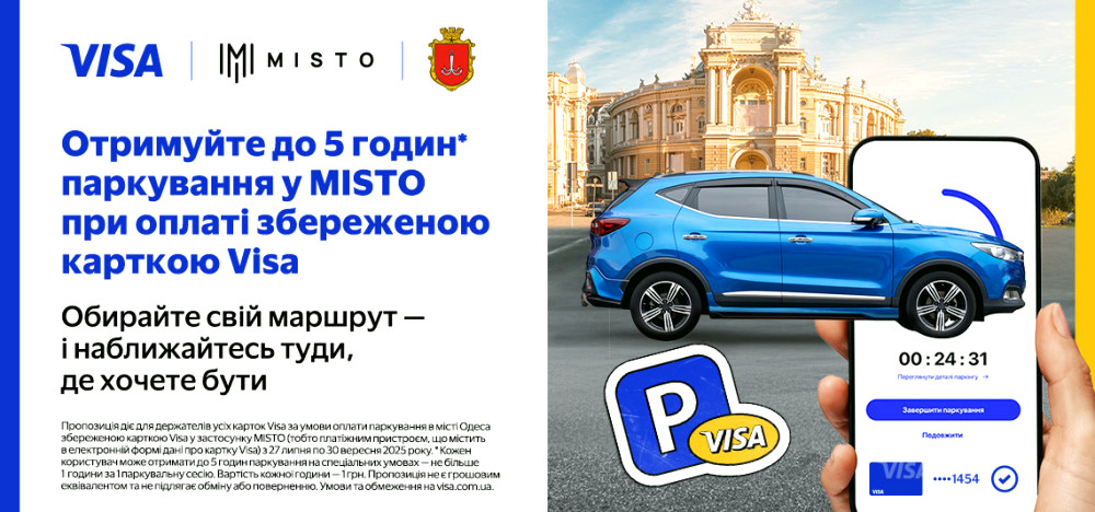 Застосунок MISTO у партнерстві з Visa запускає нову пропозицію для водіїв Одеси — отримайте до 5 годин безкоштовного* паркування.